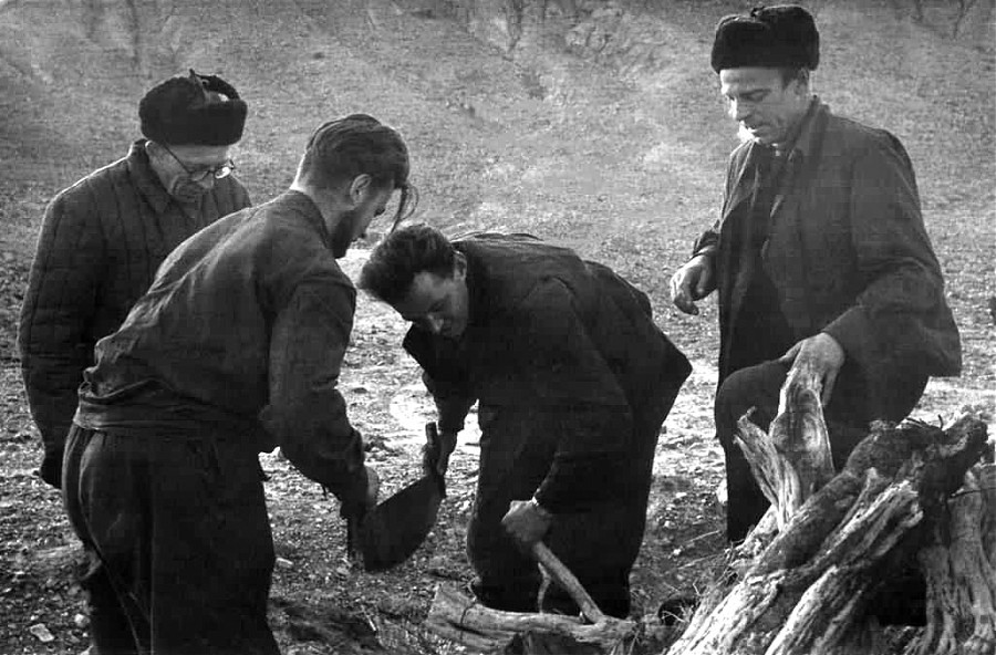 1958 г. За распиловкой саксаула Р.А. Курушин, С.Д. Хилько. Наблюдают Н.А. Флоренсов и Н.А. Логачев. Гобийский Алтай, урочище Улан-Булак, Монголия.