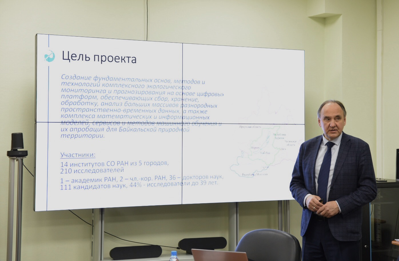 Справка: В ходе визита президента РАН академика Александра Михайловича Сергеева в новосибирский Академгородок московской делегации рассказали об одном из крупных проектов-стомиллионников, который посвящен фундаментальным основами, методам и технологиям цифрового мониторинга и прогнозирования экологической обстановки Байкальской природной территории. Проект объединил 14 научных институтов из 5 городов Сибири и 210 исследователей.